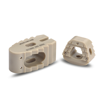 脊柱椎间融合器分块状融合器、片状融合器二种型式。融合器主体选用符合YY/T0660-2008标准中规定的聚醚醚酮( PEEK)聚合物材料制造,材料级别为LT1级。融合器中的显影针选用符合GB/T13810-2007标准中规定的TC4钛合金材料。